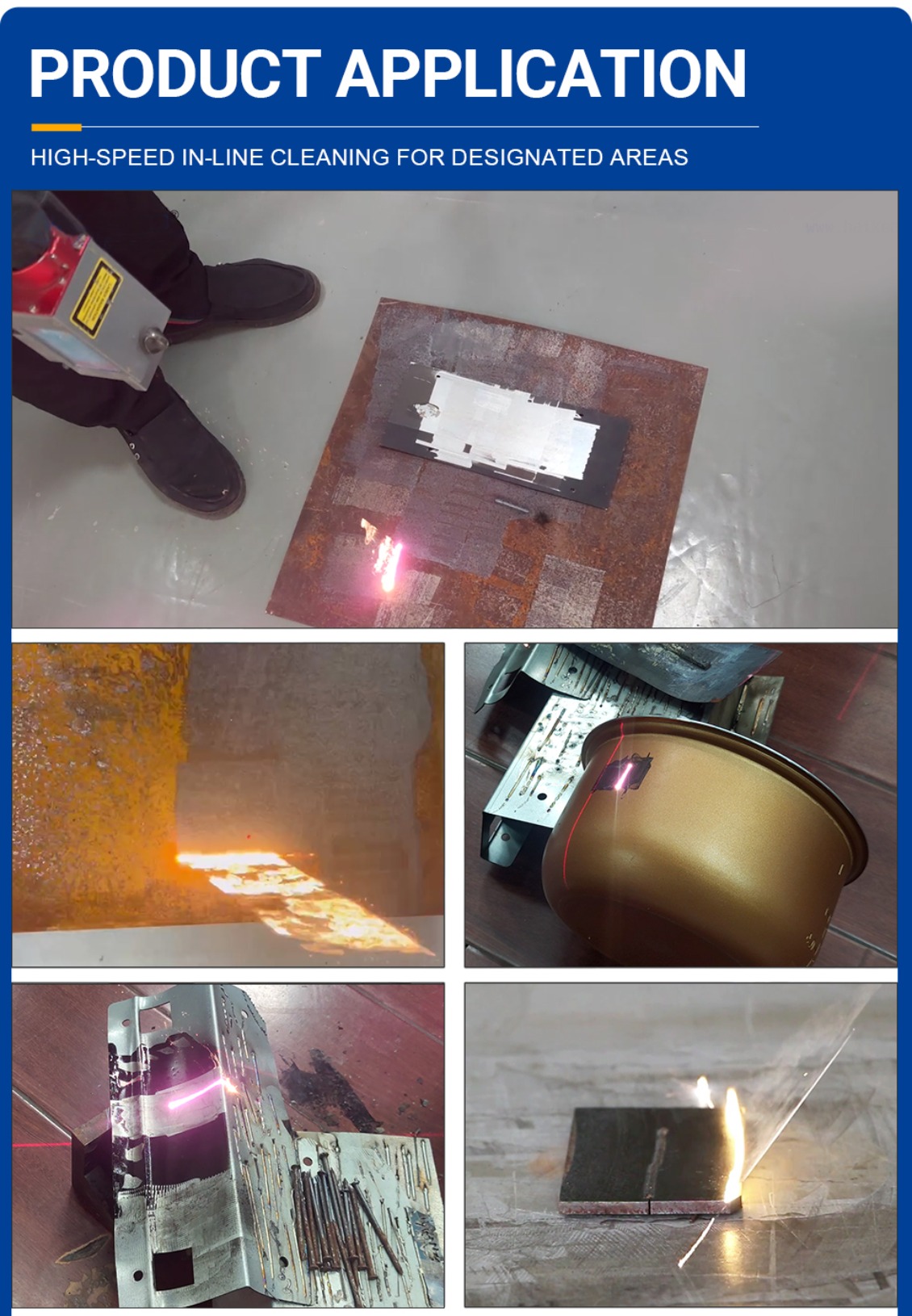 | Remove surface resin, paint, oil stains, dirt, rust, coatings, and oxidation layers from objects; this process is widely used in industries such as shipbuilding, auto repair, rubber molding, high-end machine tools, rail tracks, and environmental protection. |